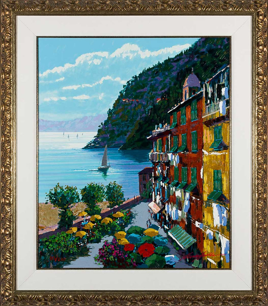 "Cinqueterre" is an enhanced serigraph on canvas created by Kerry Hallam in 2001. From the deluxe edition of 250 on canvas, the edition also included 250 on white paper for a total edition size of 500. The artwork is signed 'Kerry Hallam' lower right and annotated lower left. The canvas size is 32 x 27" and the artwork is framed in an ornate, gold-tone frame. The artwork ships framed and accompanied by a certificate of authenticity.