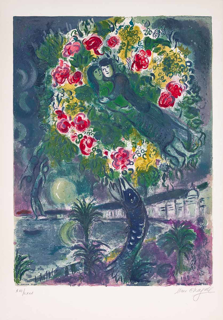 "Couple and Fish (CS.34)" is a lithograph created by Marc Chagall in 1967 for his series 'Nice et la Côte d'Azur'. From the edition of 235, the artwork is signed 'Marc Chagall' lower right and annotated lower left. The image size is 24 x 18" and the artwork is framed in a custom, closed-corner, gold leaf frame. The artwork ships framed and accompanied by a certificate of authenticity.
