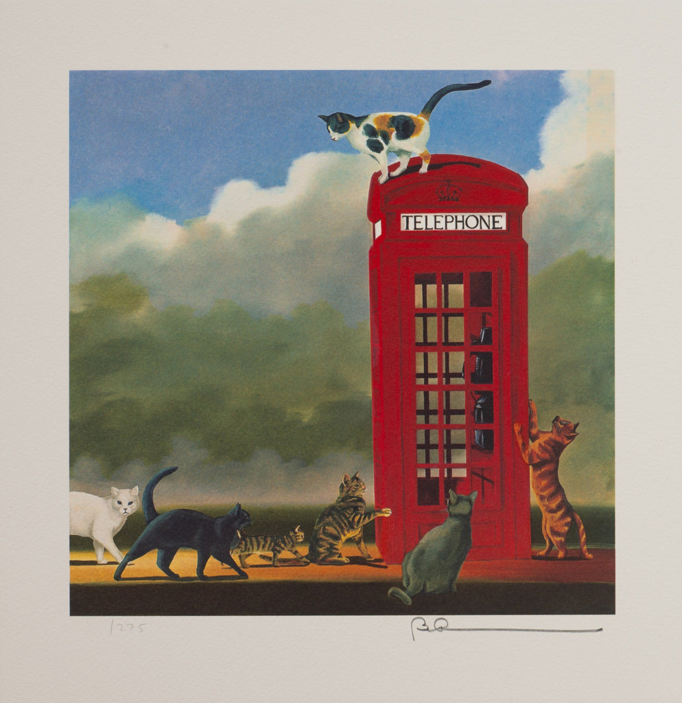 "Cat Call" is a lithograph on paper created by Robert Deyber in 2015. From the edition of 395,the artwork is initialed 'BD' lower right and annotated lower left. The image size is 9 x 9" and the artwork is framed in a contemporary, silver-tone frame. The artwork ships framed and accompanied by a certificate of authenticity.