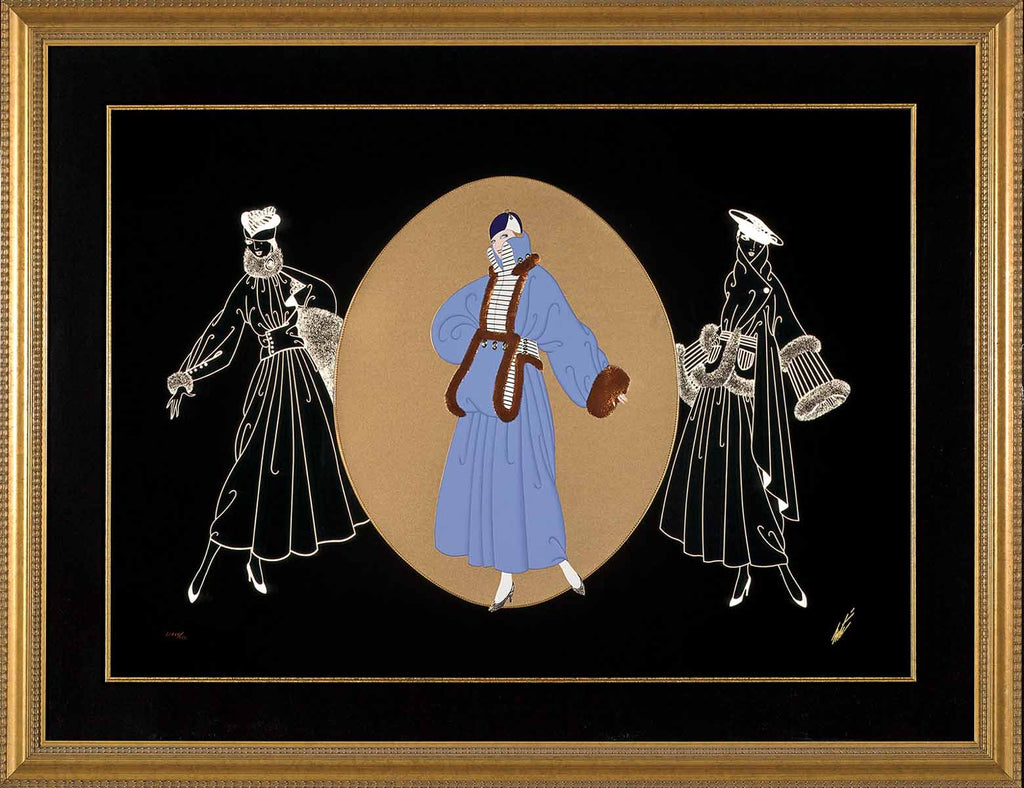 Erté was born Romain de Tirtoff in St. Petersburg, Russia on November 23rd, 1892 and was raised amidst Russia's social elite. At the age of five he created an evening gown for his mother and managed to persuade the adults to craft it, they were astounded by the results. In 1912, Romain left St. Petersburg for Paris at the age of nineteen with the aim of becoming an artist. After working with Paul " Le Magnifique" Poiret on several theatrical productions Romain, still under the pseudonym of Erte, began to work more independently. He hand-crafted original costume and fashion designs for many of the era’s most renowned actresses, including Joan Crawford, Lillian Gish, Marion Davies, Anna Pavlova, Norma Shearer, and others. His masterpieces for the stage included extravagant production designs at venues such as New York’s Radio City Music Hall, the Casino de Paris, and the Paris Opera. In 1915 he began his long professional relationship with Harper's Bazaar and created 240 covers for the esteemed magazine. For 6 months in 1916, Erté simultaneously worked with Vogue as well. As a result of his highly publicized success, Erté would later be called the father of the ‘Art Deco’ movement.