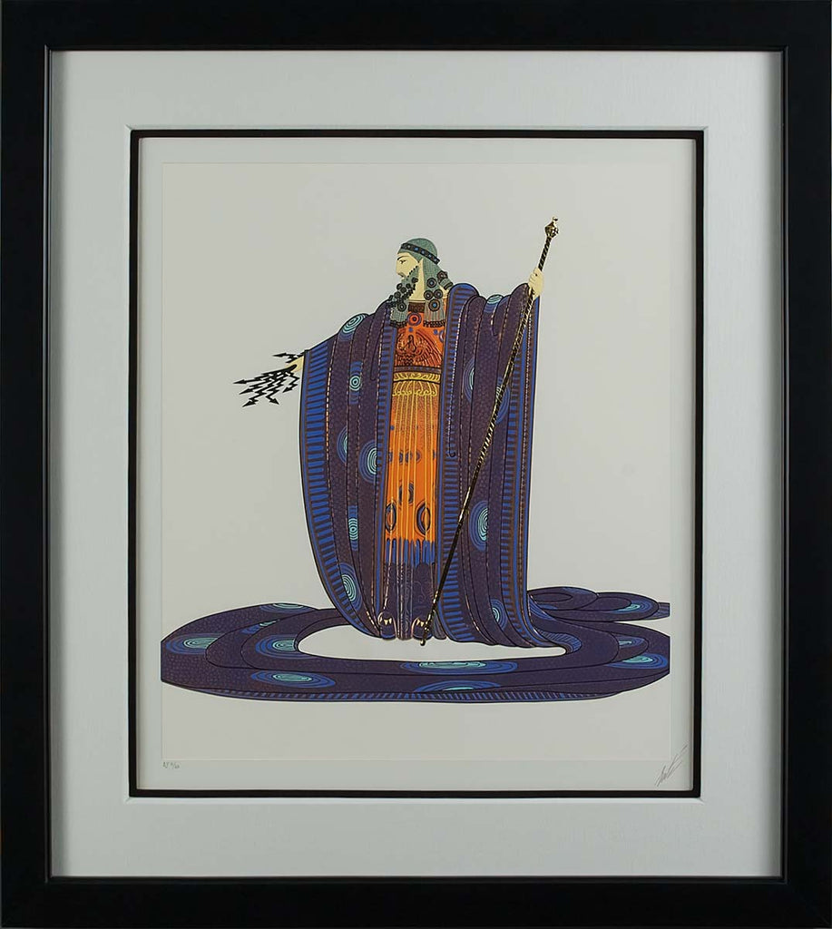 "Zeus" is a serigraph created by Erté in 1981. From the edition of 471, and the artwork is signed 'Erté' lower right. The image size 22.5 x 19" and the artwork is framed in a contemporary black frame. The artwork ships framed and accompanied by a certificate of authenticity.