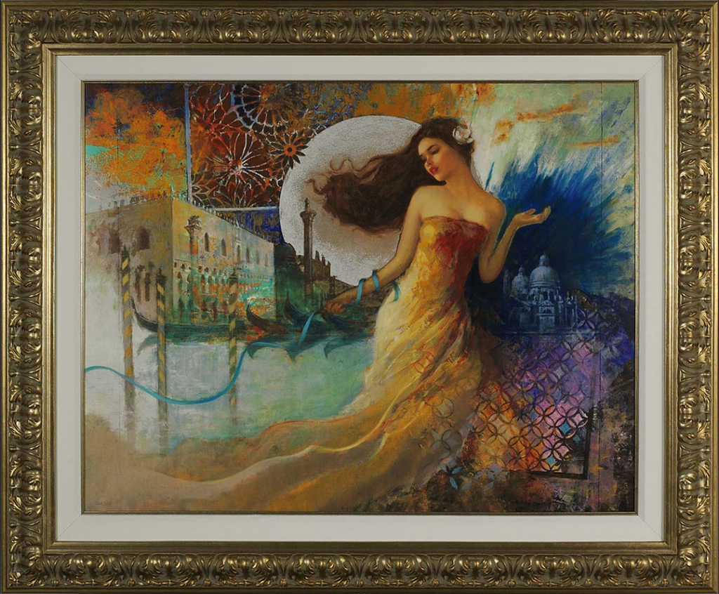 "Venise Éclatante" is a serigraph on canvas created by François Fressinier in 2012. From the edition of 325, the artwork is signed 'FRESSINIER' lower right and annotated lower left. The canvas size is 28.5 x 36" and the artwork is framed in a custom, ornate, gold-tone frame. The artwork ships framed and accompanied by a certificate of authenticity.
