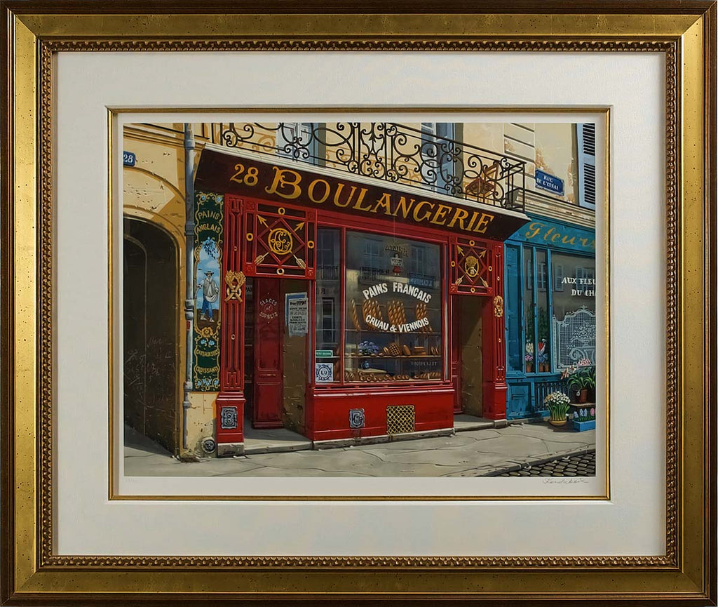 "28 Boulangerie" is a serigraph on paper created by Liudmila Kondakova in 2001. From the edition of 250 on white paper, the edition also included 250 on canvas for a total edition size of 500. The artwork is signed 'Kondakova' lower right and annotated lower left. The image size is 18 x 24" and the artwork is framed in an classic, gold-tone frame. The artwork ships framed and accompanied by a certificate of authenticity.