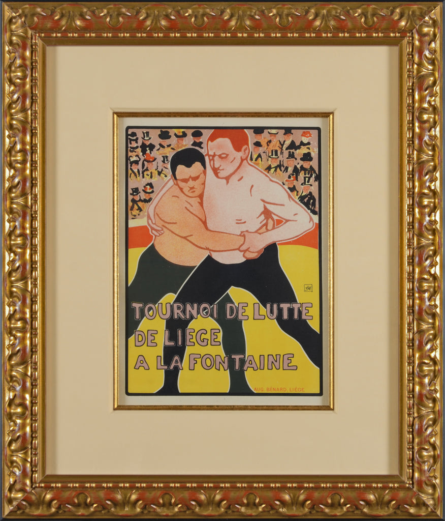 “Wrestling Tournament (Plate 224)” was created by Armand Rassenfosse, who was a largely self-taught Belgian graphic artist, book illustrator, and painter. His masterwork was a set of illustrations for Charles Baudelaire’s “Les Fleurs du Mal”. “Wrestling Tournament (Plate 224)” is a 12.75 x 9.25 – inch original stone lithograph created in 1900.