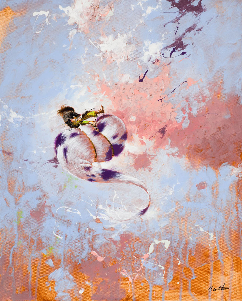 "Rodeo Fantasy" is an acrylic on canvas painting created by Philippe Bertho in 2024. The painting is signed 'Bertho' lower right. The canvas size is 16.12 x 13" and the artwork is framed in a contemporary white frame. The artwork ships framed.