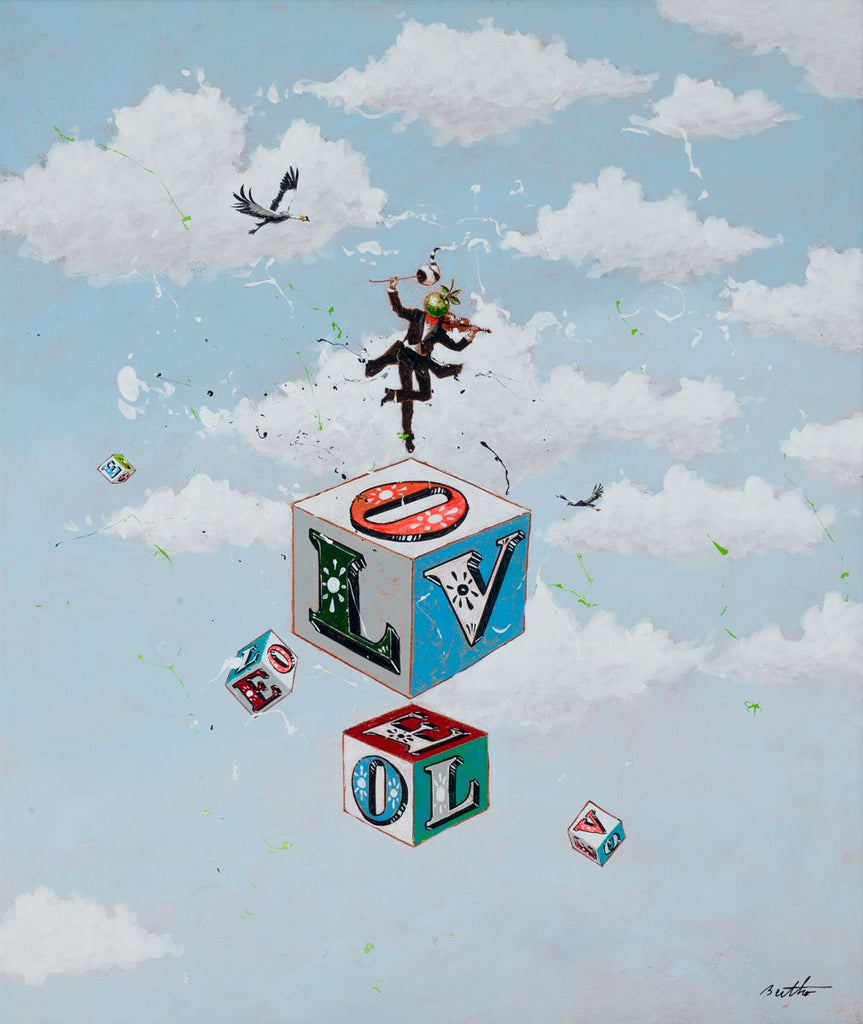 "Tralala Love" is an acrylic on canvas painting created by Philippe Bertho in 2023. The painting is signed 'Bertho' lower right. The canvas size is 21.5 x 18.25" and the artwork is framed in a contemporary white frame. The artwork ships framed.