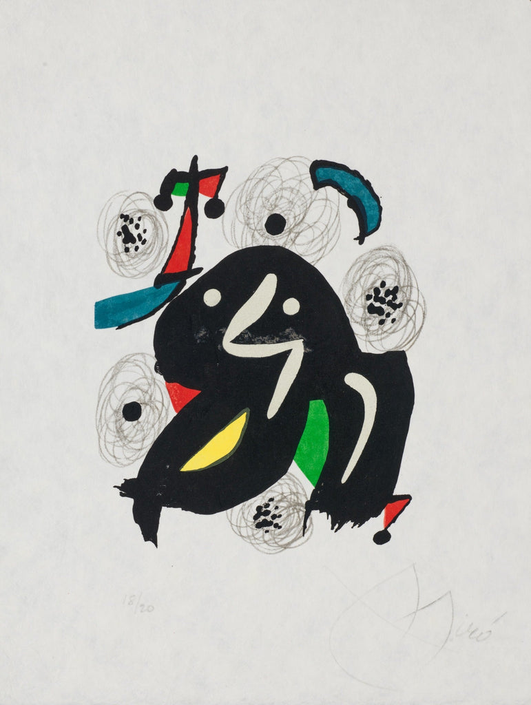Joan Miró is regarded as one of the most original artists of the 20th century, who often worked with a limited palette, yet the colors he used were bold and expressive. His mature style evolved from the tension between his fanciful, poetic impulse and his vision of the harshness of modern life. Miró worked extensively in lithography and produced many murals, tapestries, and sculptures for public spaces. Despite his fame, he continued to devote himself exclusively to looking and creating. Joan Miró was born in Barcelona, Spain on April 20, 1893. His father was an artisan watchmaker and goldsmith. Based on his parents’ wishes, Miró attended a commercial college, then found work as a clerk in an office for a short period of time. Unfulfilled by his profession, Miró asked for his parent’s permission to allow him to attend art school in Barcelona in 1912. There, he gained great experience learning under Francisco Galí.