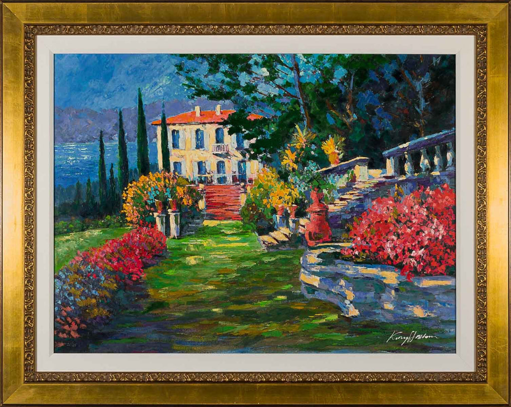 "Villa Como" is an enhanced serigraph on canvas created by Kerry Hallam in 2003. From the edition of 50, the artwork is signed 'Kerry Hallam' lower left and annotated lower right. The canvas size is 30 x 40" and the artwork is framed in a classic, gold-tone frame. The artwork ships framed and accompanied by a certificate of authenticity.