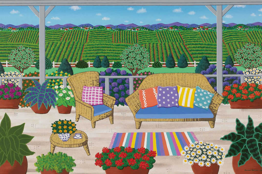 "Vineyard" is an acrylic on canvas created by Joanne Nettis. The image size is 23" x 35" -inch. The artwork ships framed, signed and with a certificate of authenticity.