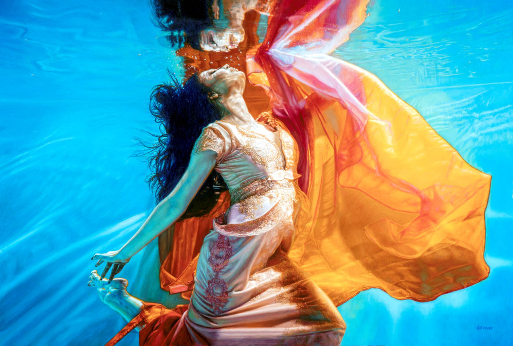 "Water Color" is an oil on panel painting created by Douglas Hofmann in 2021. The artwork is signed 'HOFMANN' lower right. The image size is 32 x 48" and the artwork is framed in a contemporary white frame. The artwork ships framed.