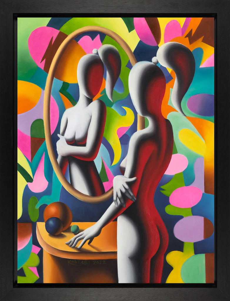 "What Becomes Me” is an oil on canvas painting created by Mark Kostabi in 2022. The artwork is signed and dated 'KOSTABI 2022' lower left. The canvas size is 24.75 x 18.5" and the artwork is framed in a contemporary black frame. The artwork ships framed.