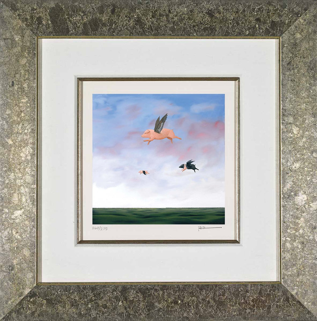 "When Pigs Fly" is a 9.5 x 9 - inch Robert Deyber Lithograph. "When Pigs Fly" comes framed, signed and with a certificate of authenticity.