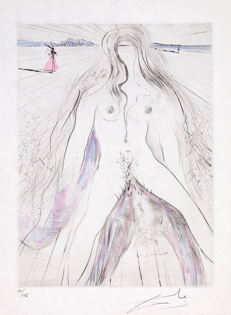 "Woman on Horseback" is a drypoint with watercolor created by Salvador Dalí for his 1969 series 'Venus in Furs'. From the edition of 730, the artwork is signed 'Dalí' lower right and annotated lower left. The image size is 12.25 x 9.75". The artwork ships framed and accompanied by a certificate of authenticity.