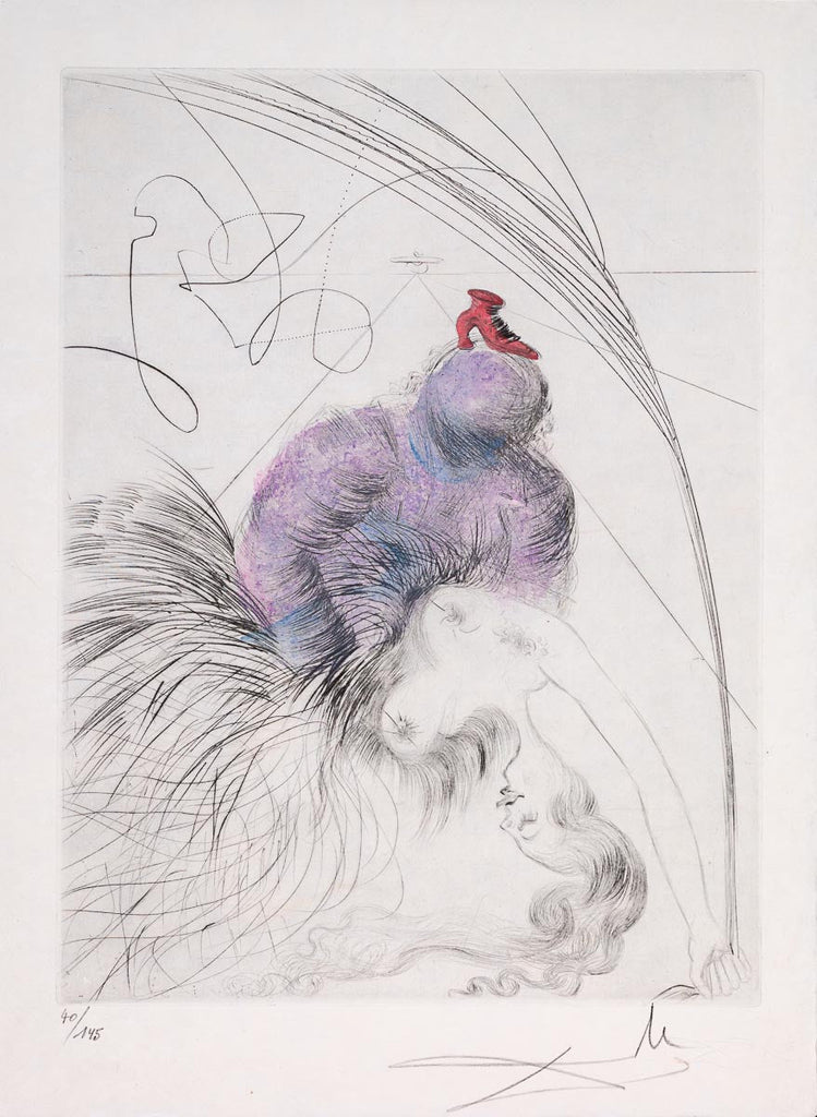 "Woman with Shoe" is a drypoint with watercolor created by Salvador Dalí for his 1969 series 'Venus in Furs'. From the edition of 730, the artwork is signed 'Dalí' lower right and annotated lower left. The image size is 12.25 x 9.75". The artwork ships framed and accompanied by a certificate of authenticity.