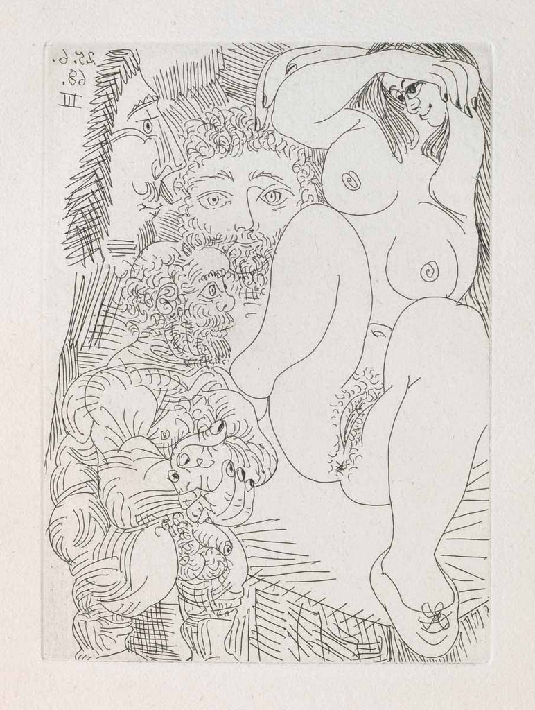 "Young Courtesan with Gentleman, Sculptor and Salivating Old Man (B.1665)" is an etching created by Pablo Picasso in 1968 for his series 'La Célestine'. From the edition of 400, the image size is 5 x 3.5". The artwork ships framed and accompanied by a certificate of authenticity.