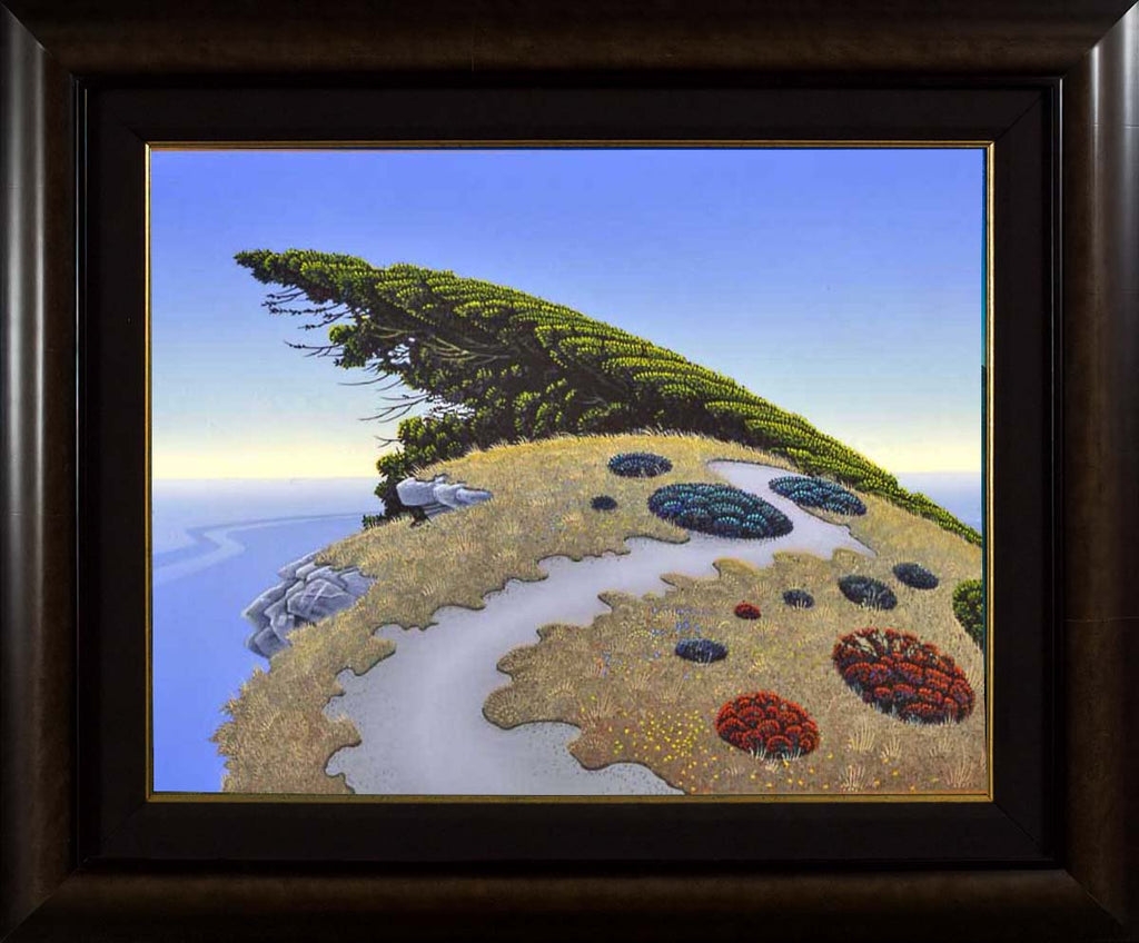 "Z-Curve" is an acrylic and prismacolor on vinyl film, on plexiglass paintings created by Bruce Ricker. The artwork is signed 'RICKER' lower right. The image size is 7 x 12" and the artwork is framed in a contemporary wood frame. The artwork ships framed.