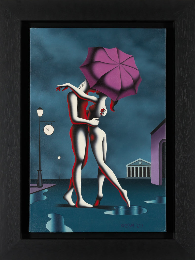 "Eternal Effluence” is an oil on canvas painting created by Mark Kostabi in 2019. The artwork is signed and dated 'KOSTABI 2019' lower right. The canvas size is 23.5 x 16" and the artwork is framed in a contemporary black frame. The artwork ships framed.