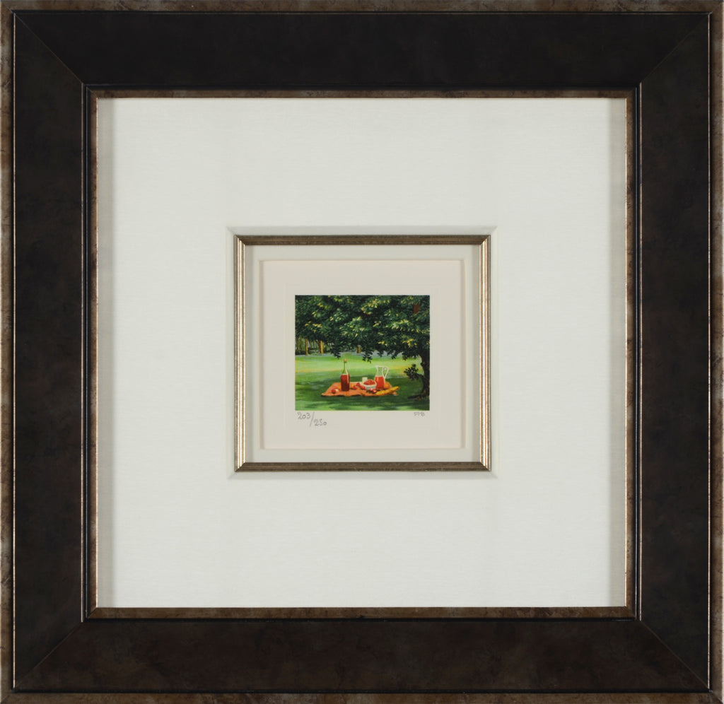 "Picnic" is a lithograph created by Fanny Brennan in 2000. From the edition of 300, the artwork is initialed 'FMB' lower right and annotated lower left. The image size is 2.5 x 3" and the artwork is framed in a contemporary silver and dark gray frame. The artwork ships framed and accompanied by a certificate of authenticity.