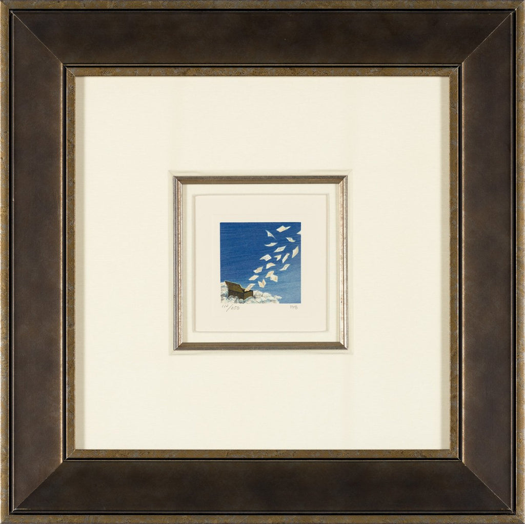 "Love Letters" is a lithograph created by Fanny Brennan in 2000. From the edition of 300, the artwork is initialed 'FMB' lower right and annotated lower left. The image size is 2.25 x 2.25" and the artwork is framed in a contemporary silver and dark gray frame. The artwork ships framed and accompanied by a certificate of authenticity.