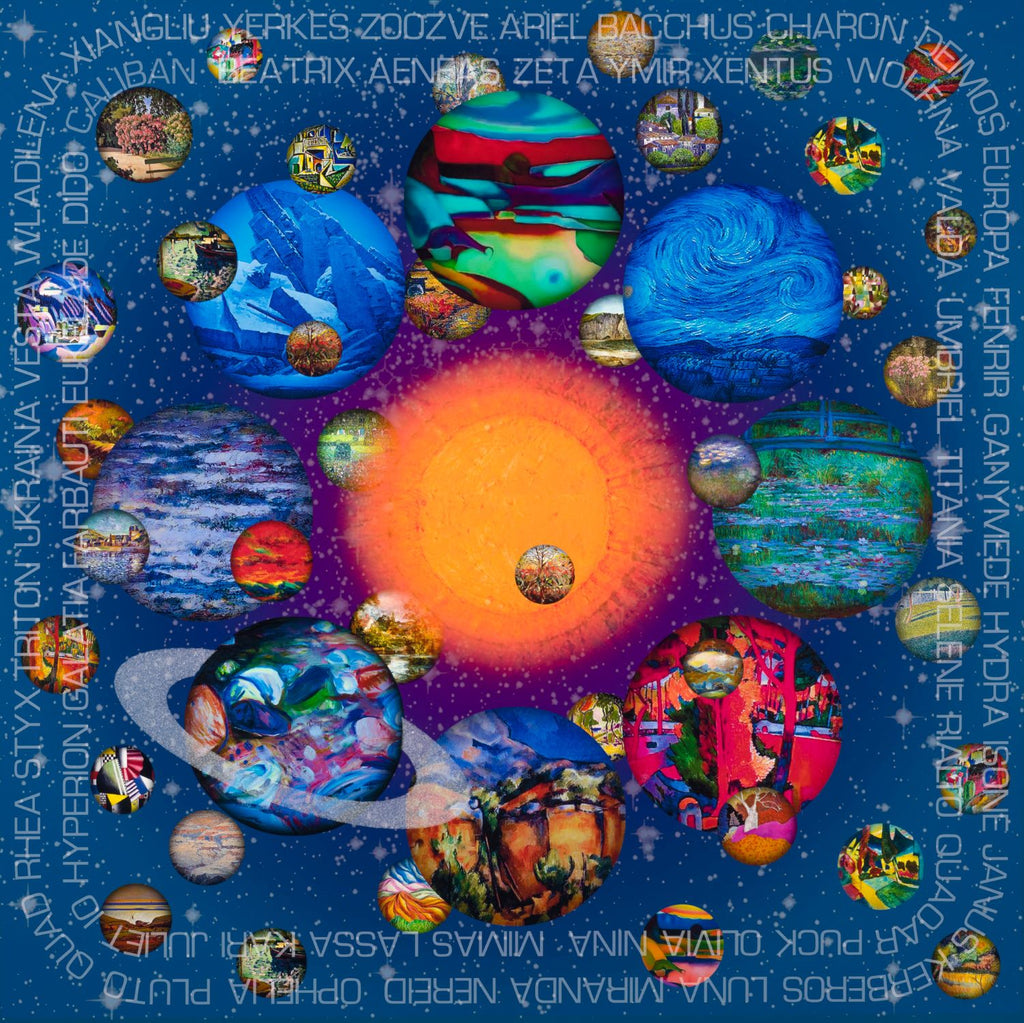 Brad Faine brings our beautiful solar system to life with imaginative pairings of great landscape paintings with our many planets and moons. The eight major planets circle around a glowing sun by Van Gogh. The Earth and our Moon are graced by images of Monet’s water lilies and the rest of the planets are (Mercury) Georgia O'Keeffe, (Venus) Vincent van Gogh, (Mars) Andre Derain, (Jupiter) Paul Cezanne, (Saturn) Edvard Munch, (Uranus) Jan Toorop and (Neptune) Casper David Friedrich. Additional landscape paintings represent some of the 286 moons and dwarf planets in our system, and A- Z text around the border lists many of their most famous names. The background image is taken from a NASA photograph of the solar system.