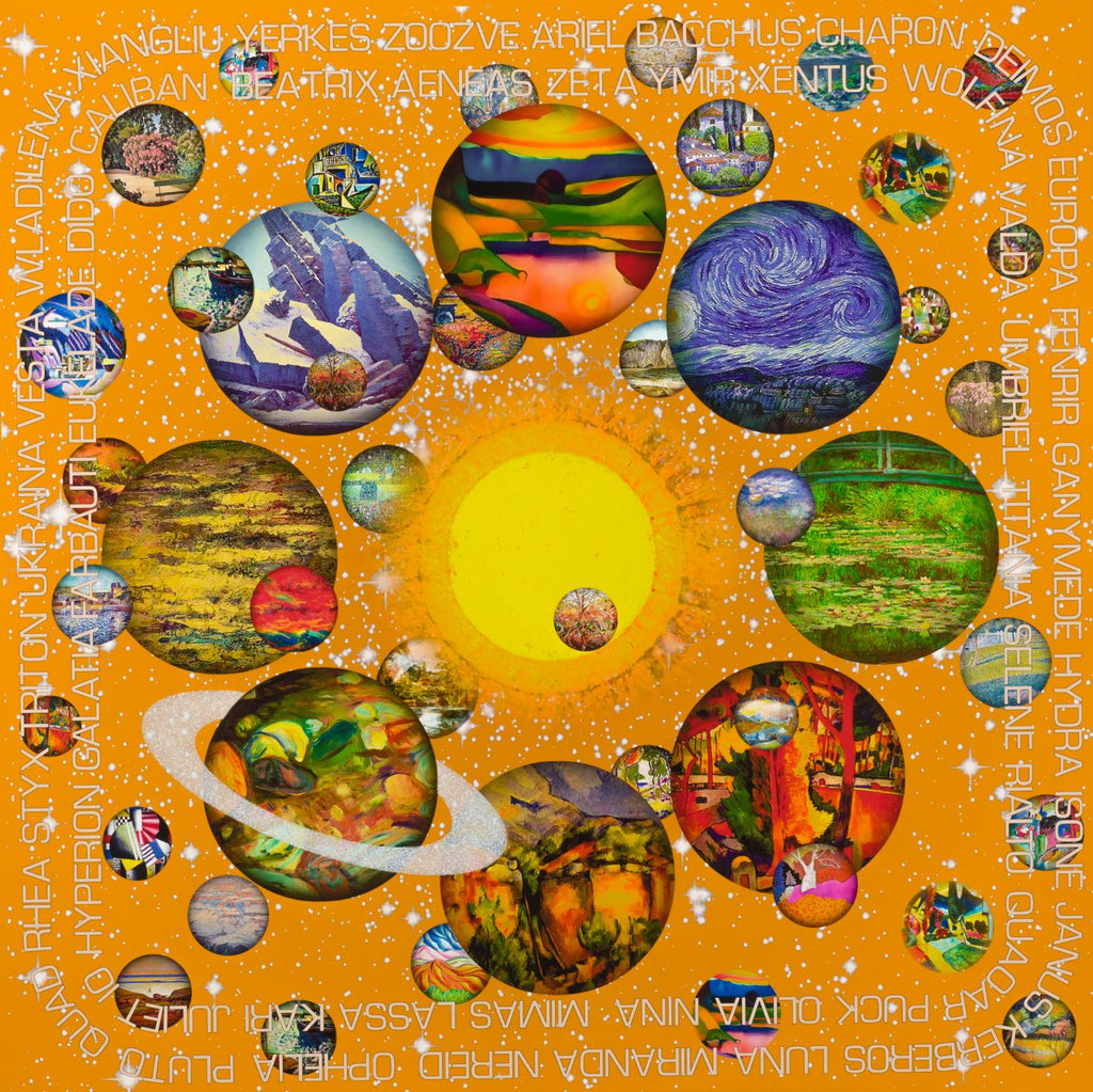 Brad Faine brings our beautiful solar system to life with imaginative pairings of great landscape paintings with our many planets and moons. The eight major planets circle around a glowing sun by Van Gogh. The Earth and our Moon are graced by images of Monet’s water lilies and the rest of the planets are (Mercury) Georgia O'Keeffe, (Venus) Vincent van Gogh, (Mars) Andre Derain, (Jupiter) Paul Cezanne, (Saturn) Edvard Munch, (Uranus) Jan Toorop and (Neptune) Casper David Friedrich. Additional landscape paintings represent some of the 286 moons and dwarf planets in our system, and A- Z text around the border lists many of their most famous names. The background image is taken from a NASA photograph of the solar system.