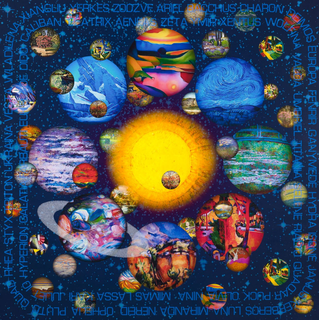 Brad Faine brings our beautiful solar system to life with imaginative pairings of great landscape paintings with our many planets and moons. The eight major planets circle around a glowing sun by Van Gogh. The Earth and our Moon are graced by images of Monet’s water lilies and the rest of the planets are (Mercury) Georgia O'Keeffe, (Venus) Vincent van Gogh, (Mars) Andre Derain, (Jupiter) Paul Cezanne, (Saturn) Edvard Munch, (Uranus) Jan Toorop and (Neptune) Casper David Friedrich. Additional landscape paintings represent some of the 286 moons and dwarf planets in our system, and A- Z text around the border lists many of their most famous names. The background image is taken from a NASA photograph of the solar system.