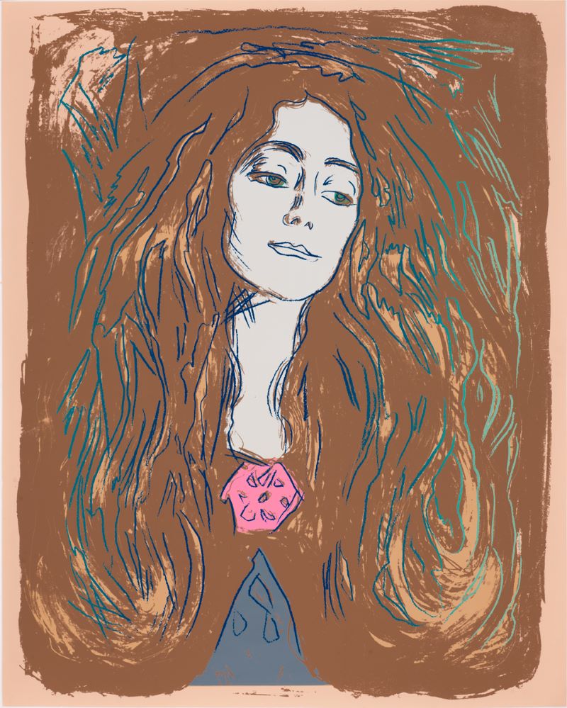 "Eva Mudocci (After Munch), (FS.IIIA.59)" is a screenprint on Lenox Museum Board created by Andy Warhol in 1984. Commissioned as an edition print which was never published, this artwork is accompanied by Andy Warhol Art Authentication Board authentication documents dated July 30, 2002. The image size is 40 x 32" and the artwork is framed in a custom, closed corner, gold leaf frame. The artwork ships framed and is accompanied by a certificate of authenticity.