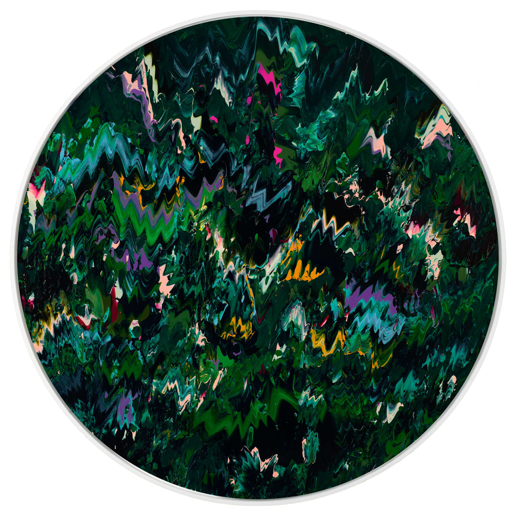 "Ode to Emerald" is an acrylic on canvas painting created by Robert Standish in 2023. The painting is signed, titled and dated on verso. The canvas size is 30" diameter and the artwork is framed in a contemporary white circular frame. The artwork ships framed.