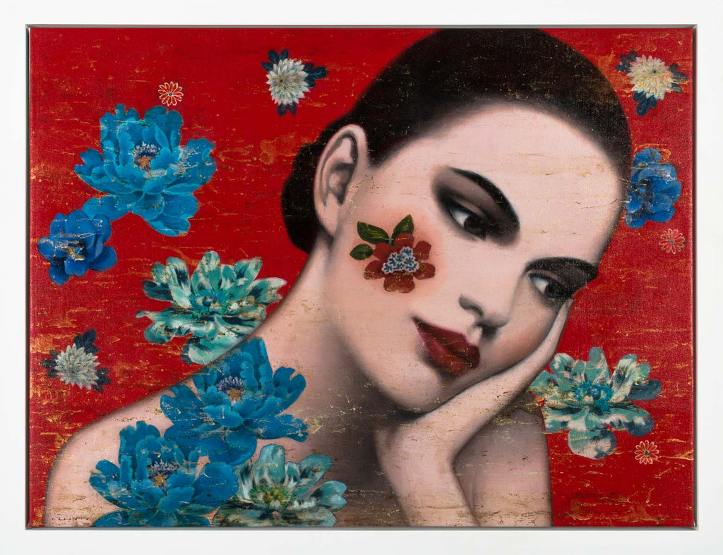 "Heart to Heart" is an oil and mixed media on canvas painting created by François Fressinier in 2021. The artwork is signed 'FRESSINIER' lower left. The canvas size is 30 x 40" and the artwork ships framed in a contemporary white frame. The artwork ships framed.