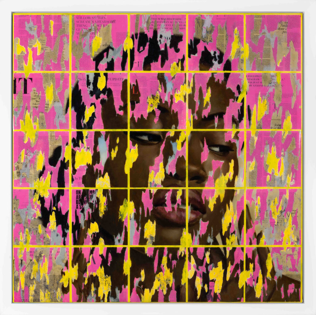 "In the Pink" is an oil and mixed media on canvas painting created by François Fressinier in 2023. The artwork is signed 'FRESSINIER' lower left. The canvas size is 38.62 x 39" and the artwork ships framed in a contemporary white frame. The artwork ships framed.