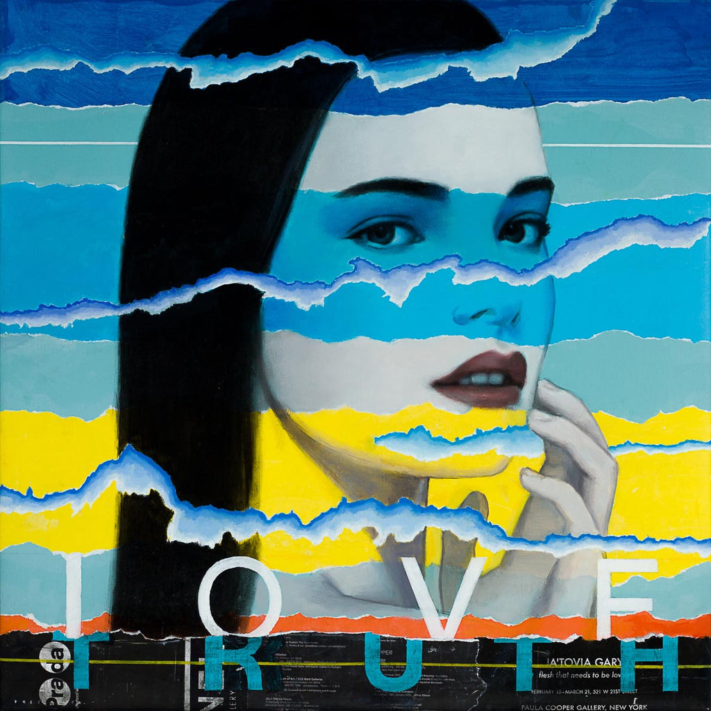 "Love Truth" is an oil and mixed media on canvas painting created by François Fressinier in 2021. The artwork is signed 'FRESSINIER' lower left. The canvas size is 30 x 30". The artwork ships framed.