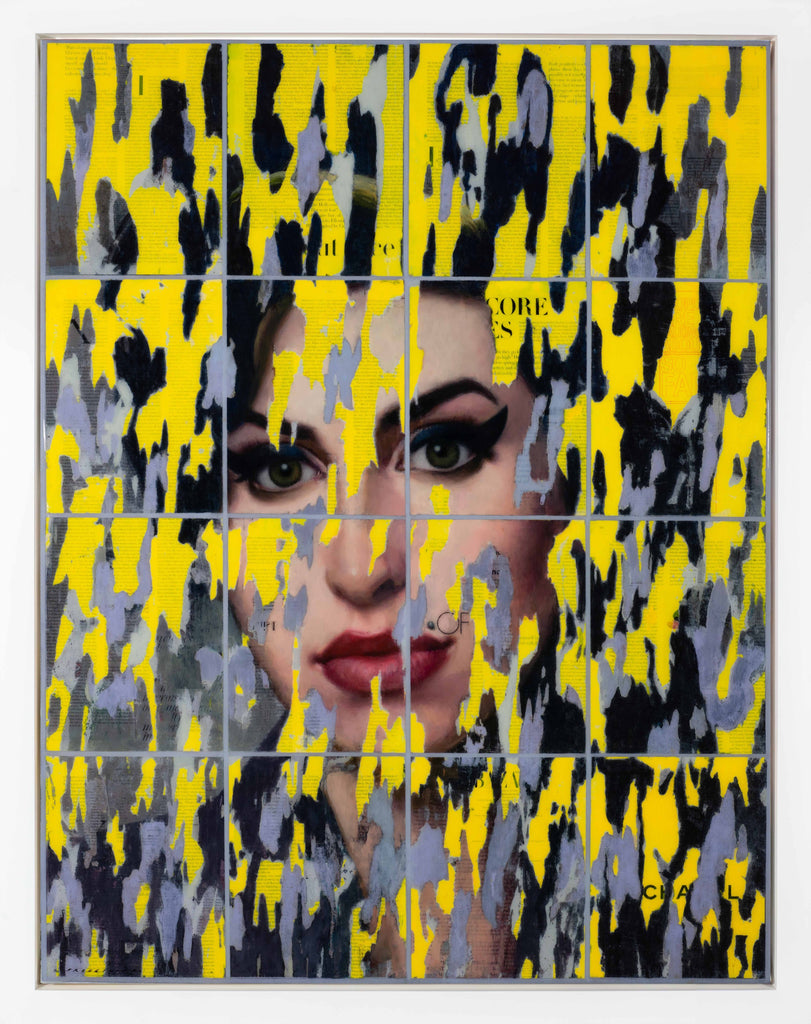 "Miss Amy" is an oil and mixed media on canvas painting created by François Fressinier in 2023. The artwork is signed 'FRESSINIER' lower left. The canvas size is 40.12 x 31.12" and the artwork ships framed in a contemporary white frame. The artwork ships framed.