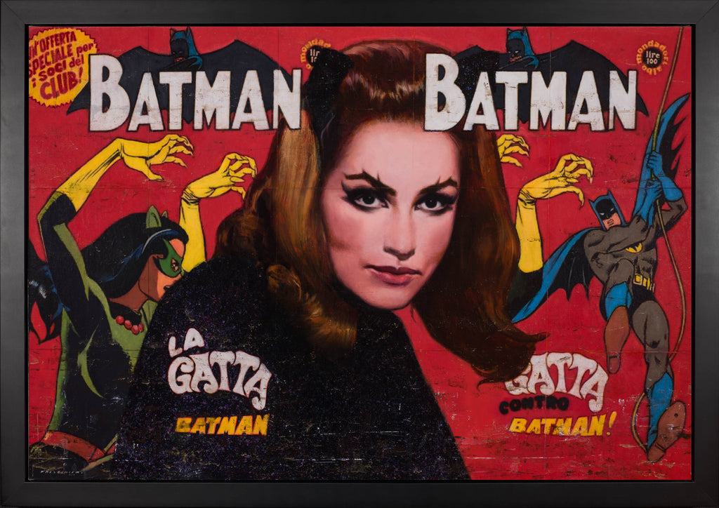 "Purr-fect" is an oil and mixed media on canvas painting created by François Fressinier in 2024. The artwork is signed 'FRESSINIER' lower left. The canvas size is 40 x 40" and the artwork ships framed in a contemporary white frame. The artwork ships framed.