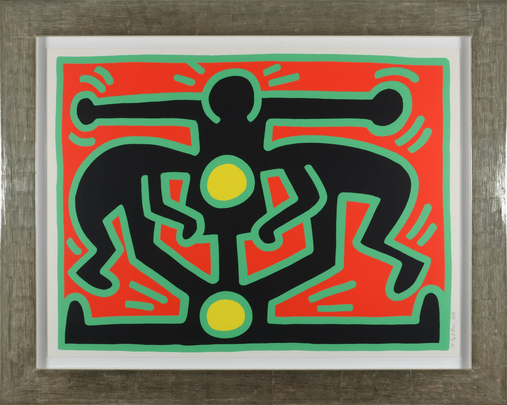 Dubbed “a child of Pop Art,” Keith Haring swiftly ascended to be among the genre’s royalty when his career soared in the 1980s. With iconic line-work and bold colors, Haring seamlessly embraced tropes of commercial culture while creating a wholly unique body of work that pushed against the status quo. As Haring wove together high and low, so too did his subject matter ricochet between tragedy (including the AIDS crisis and South African apartheid) and pure, infectious joy of being. The 1988 Growing Suite exemplifies the latter — the series bursts with vibrant color and bodies-in-motion, a style that is pure Haring and an homage to 1980s dance styles – electric boogie, break-dancing, and vogueing, to name a few.