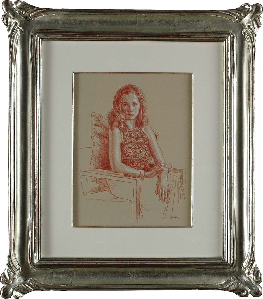 "Untitled (Seated Portrait with Pillow)" is a conté on paper drawing created by Douglas Hofmann in 2016. The drawing is signed 'HOFMANN' lower right. The image size is 13 x 10.25" and the artwork is framed in a custom ornate, gold leaf frame. The artwork ships framed.