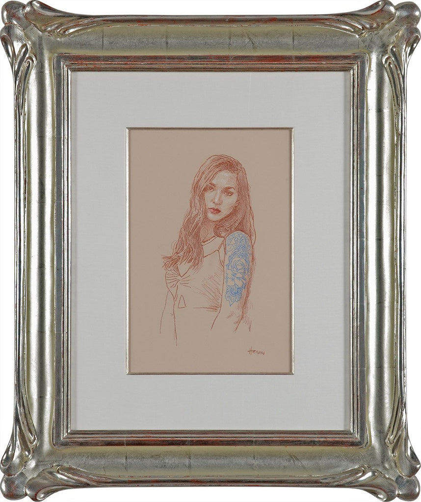 "Untitled (Portrait with Tattoo)" is a conté on paper drawing created by Douglas Hofmann in 2018. The drawing is signed 'HOFMANN' lower right. The image size is 11 x 7" and the artwork is framed in a custom ornate, gold leaf frame. The artwork ships framed.