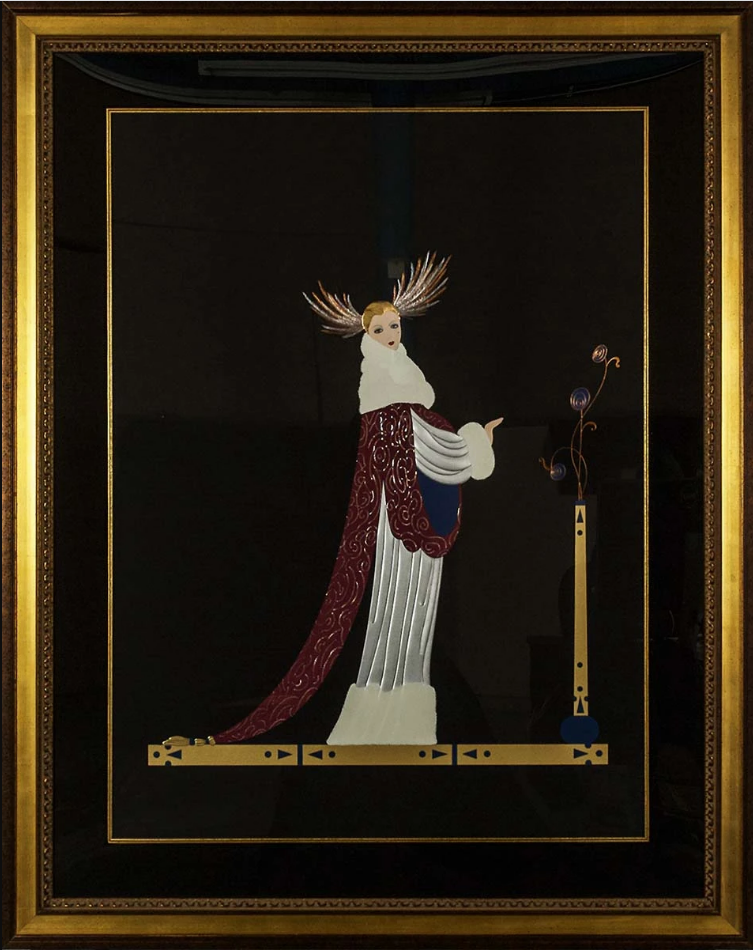 "Ermine Brocade" is an embossed serigraph with hot stamping created by Erté in 1987. From the edition of 580, the artwork is signed 'Erté' lower right. The image size is 27 x 25" and the artwork is framed in a classic, gold-tone frame. The artwork ships framed and accompanied by a certificate of authenticity.
