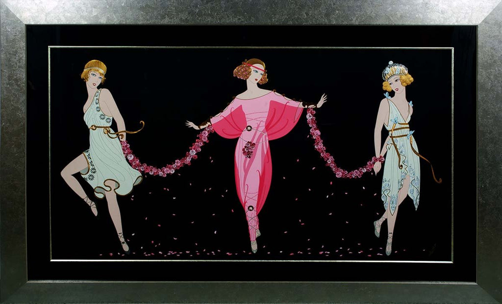 The 'Printemps' series features "April", "May", and "June" individually as well as combined in one print with the 'Printemps' title. Originally a costume design for the scene Les Rois de Legendes at the Folies Bergere in the early 1930s, the image celebrates feminine grace and the joy of life. Erté’s designs for the Folies Bergere are considered among his finest work and were said to represent exquisite color and form that was endlessly inventive, even in the smallest details. His chic illustrations portrayed models in elaborate poses adorned in exquisite jewelry, gold and elegant materials alongside a backdrop of an Art Deco style interior.