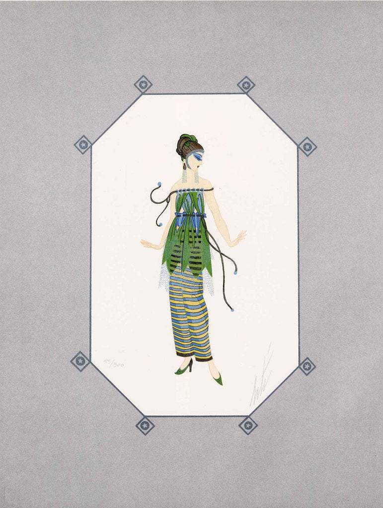 Erté was born Romain de Tirtoff in St. Petersburg, Russia on November 23rd, 1892 and was raised amidst Russia's social elite. At the age of five he created an evening gown for his mother and managed to persuade the adults to craft it, they were astounded by the results. In 1912, Romain left St. Petersburg for Paris at the age of nineteen with the aim of becoming an artist. After working with Paul " Le Magnifique" Poiret on several theatrical productions Romain, still under the pseudonym of Erte, began to work more independently. He hand-crafted original costume and fashion designs for many of the era’s most renowned actresses, including Joan Crawford, Lillian Gish, Marion Davies, Anna Pavlova, Norma Shearer, and others. His masterpieces for the stage included extravagant production designs at venues such as New York’s Radio City Music Hall, the Casino de Paris, and the Paris Opera. In 1915 he began his long professional relationship with Harper's Bazaar and created 240 covers for the esteemed magazine. For 6 months in 1916, Erté simultaneously worked with Vogue as well. As a result of his highly publicized success, Erté would later be called the father of the ‘Art Deco’ movement.