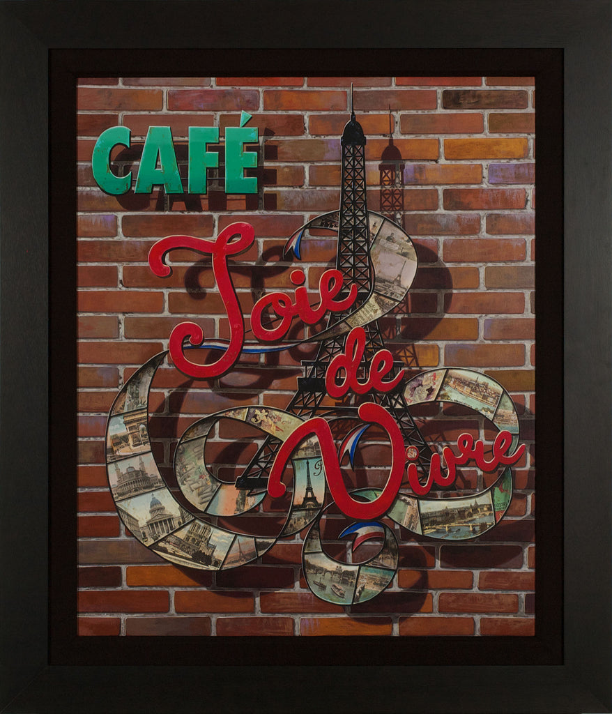 "Café Joie de Vivre" is an archival print with hand-made serigraph texture plates created by Liudmila Kondakova in 2014. From the edition of 325, the artwork is signed 'Kondakova' lower right and annotated lower left. The canvas size is 36 x 29.75" and the artwork is framed in a contemporary black frame. The artwork ships framed and accompanied by a certificate of authenticity.