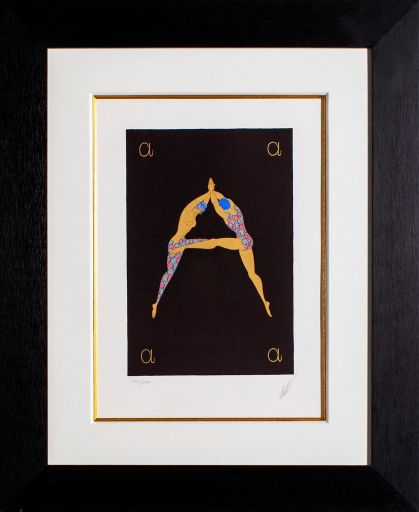 "Letter A" is a lithograph and serigraph created by Erté for his 1976 'Alphabet' suite. From the edition of 491, and the artwork is signed 'Erté' lower right. The image size 15.75 x 10.5" and the artwork is framed in a contemporary black frame. The artwork ships framed and accompanied by a certificate of authenticity.