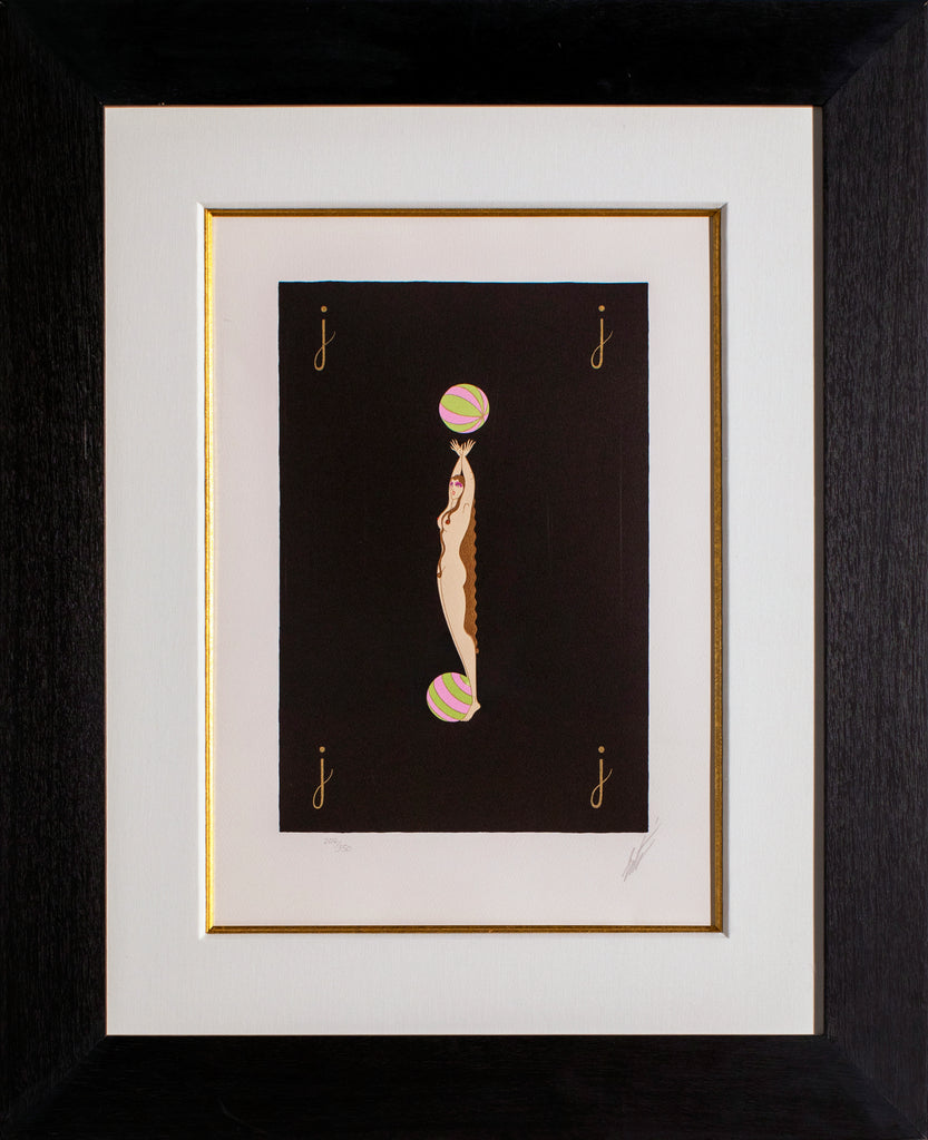 "Letter J" is a lithograph and serigraph created by Erté for his 1976 'Alphabet' suite. From the edition of 491, and the artwork is signed 'Erté' lower right. The image size 15.75 x 10.5" and the artwork is framed in a contemporary black frame. The artwork ships framed and accompanied by a certificate of authenticity.