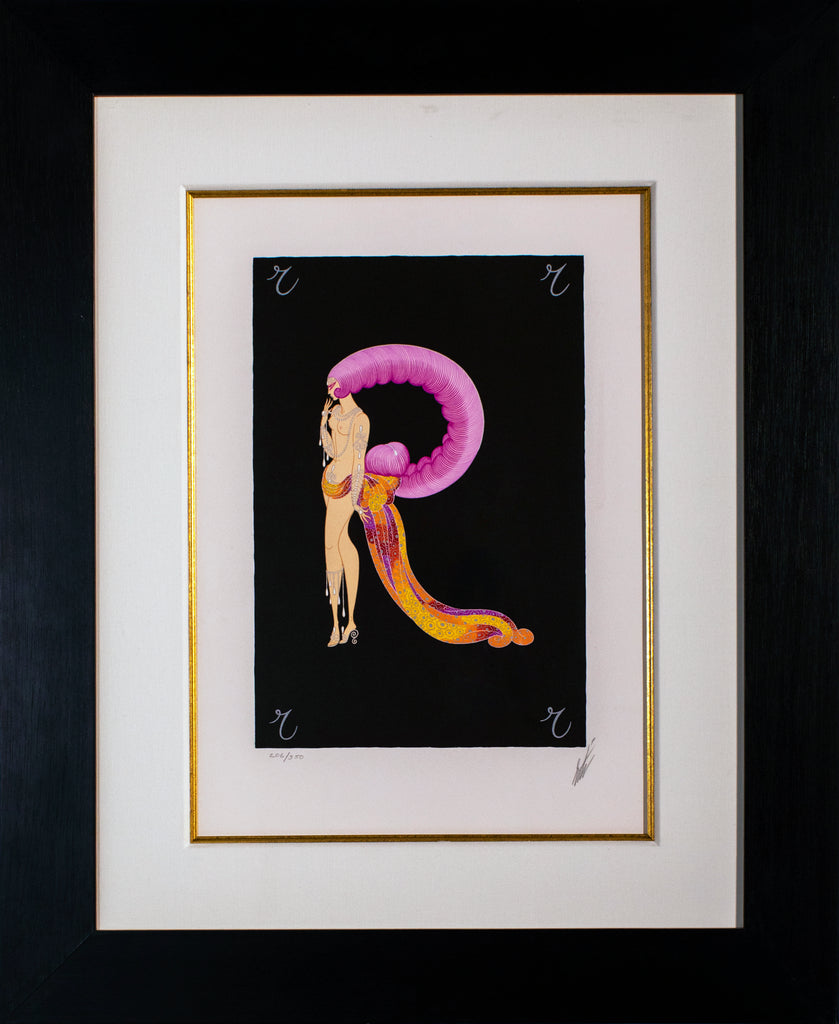 "Letter R" is a lithograph and serigraph created by Erté for his 1976 'Alphabet' suite. From the edition of 491, and the artwork is signed 'Erté' lower right. The image size 15.75 x 10.5" and the artwork is framed in a contemporary black frame. The artwork ships framed and accompanied by a certificate of authenticity.