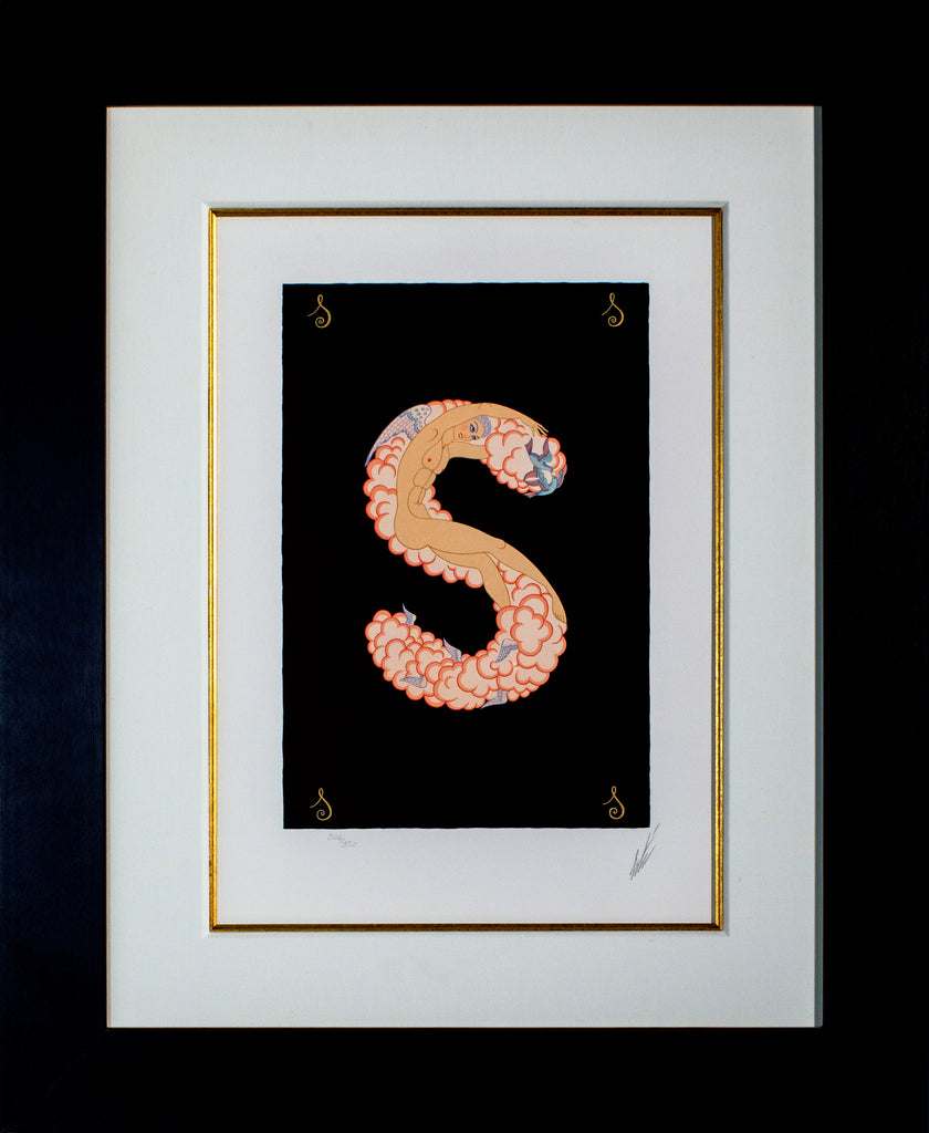 "Letter S" is a lithograph and serigraph created by Erté for his 1976 'Alphabet' suite. From the edition of 491, and the artwork is signed 'Erté' lower right. The image size 15.75 x 10.5" and the artwork is framed in a contemporary black frame. The artwork ships framed and accompanied by a certificate of authenticity.