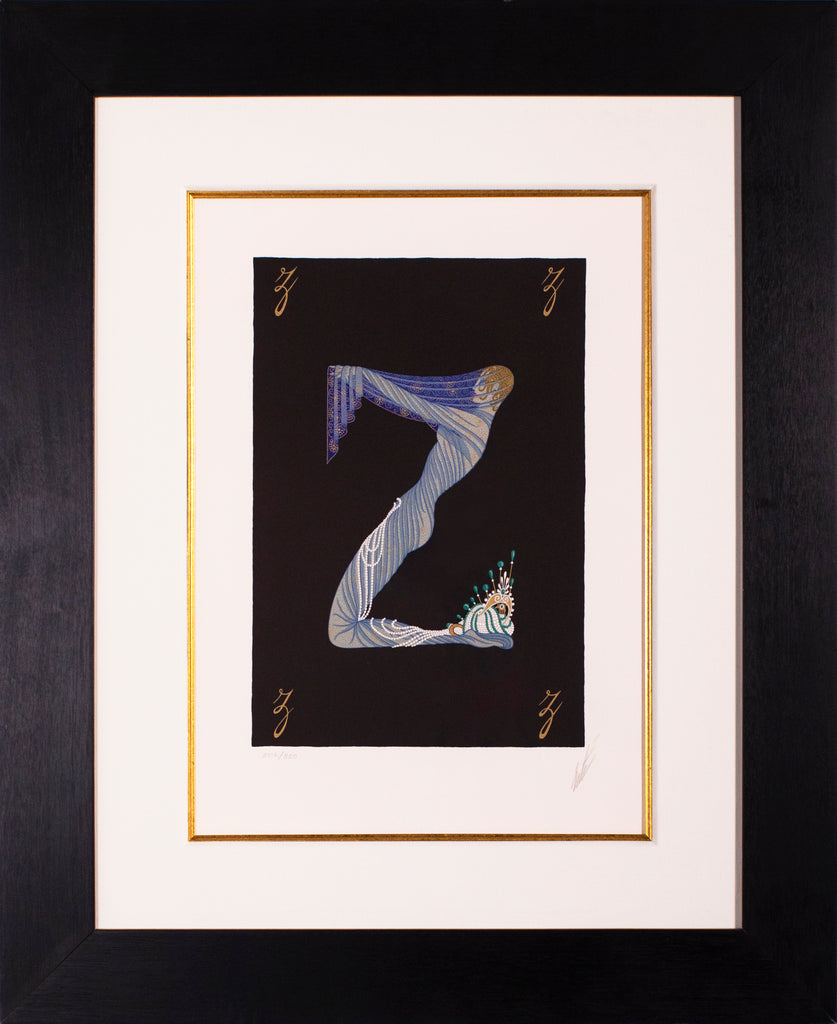 "Letter Z" is a lithograph and serigraph created by Erté for his 1976 'Alphabet' suite. From the edition of 491, and the artwork is signed 'Erté' lower right. The image size 15.75 x 10.5" and the artwork is framed in a contemporary black frame. The artwork ships framed and accompanied by a certificate of authenticity.