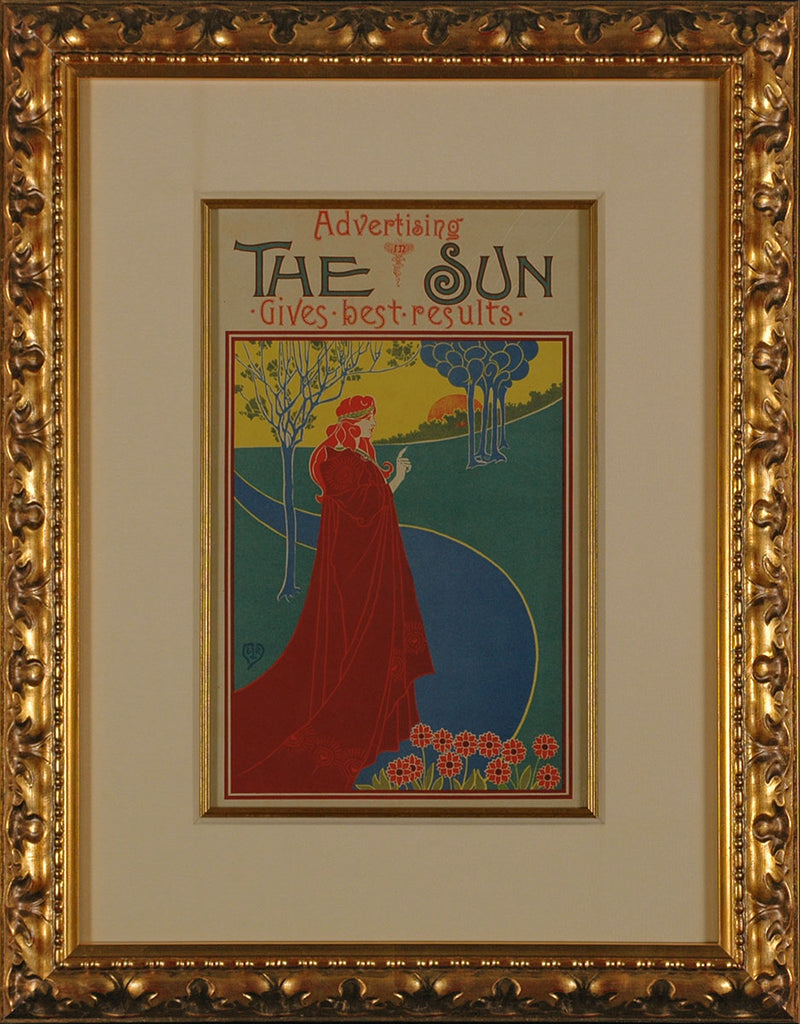 “The Sun (Plate 8)” was created by British artist Louis Rhead who studied art in Paris. Later Rhead immigrated to the United States to work as the art director for New York City’s D. Appleton & Company in 1883. Rhead’s poster designs appeared in popular magazines of the 1890s, including Century Magazine, Harper’s Bazaar and Scribner’s Magazine. In 1895 he received the Gold Medal award for Best American Poster Design at the International Poster Show in Boston. Rhead illustrated several children’s books in the early 1900s, including Robinson Crusoe, Treasure Island, and Kidnapped. “The Sun (Plate 8)” is a 14.5 x 9.25 – inch original stone lithograph created in 1896.