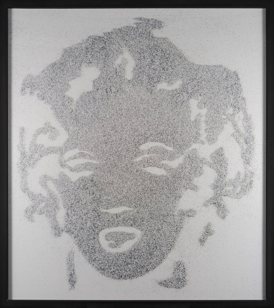 "Reversal Grey Marilyn" is a chromogenic print created by Vik Muniz in 2003 for his 'Pictures of Diamond Dust' series. The artwork is accompanied by a signature label. The image size is 55 x 49" and the artwork is framed in a contemporary black frame. The artwork ships framed and accompanied by a certificate of authenticity.