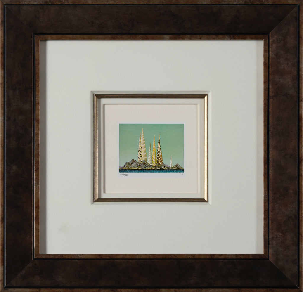 "Shell City" is a lithograph created by Fanny Brennan in 1995. From the edition of 300, the artwork is initialed 'FMB' lower right and annotated lower left. The image size is 3.25 x 4.25" and the artwork is framed in a contemporary silver and dark gray frame. The artwork ships framed and accompanied by a certificate of authenticity.