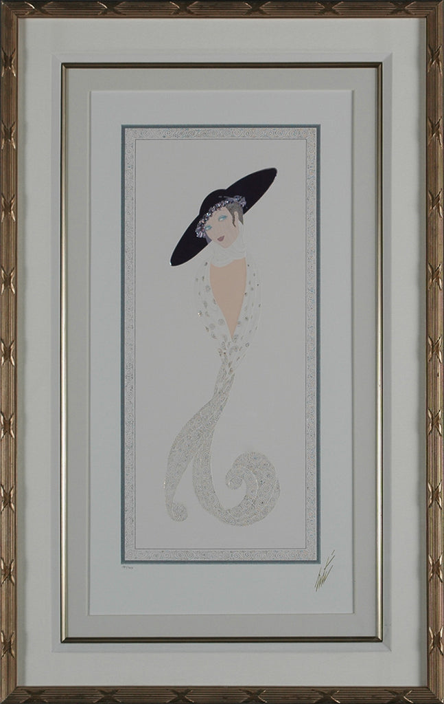 "A Glance" is a serigraph created by Erté in 1990. The image is based on a fashion drawing for Harper's Bazaar, August 1922. From the edition of 650, the artwork is estate stamped with the artists signature lower right. The image size is 19.75 x 9" and the artwork is framed in a classic 'reed and ribbon' gold-tone frame. The artwork ships framed and accompanied by a certificate of authenticity.