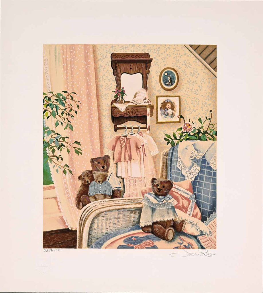 "The New Arrival" is a serigraph created by Susan Rios. The image size is 14 x 12 -inch. The artwork ships framed, signed and with a certificate of authenticity.